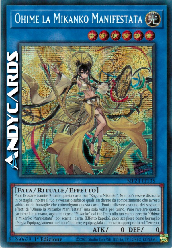 Puoi Evocare tramite Rituale questa carta con "Kagura Mikanko". Non può essere distrutta in battaglia, inoltre il tuo avversario subisce qualsiasi danno da combattimento che avresti subito tu da battaglie che coinvolgono questa carta. Puoi utilizzare ognuno dei seguenti effetti di "Ohime la Mikanko Manifestata" una sola volta per turno. Puoi rivelare questa carta nella tua mano; aggiungi 1 carta "Mikanko" dal tuo Deck alla tua mano, eccetto "Ohime la Mikanko Manifestata", poi scarta 1 carta. (Effetto Rapido): puoi scegliere come bersaglio 1 Magia Equipaggiamento nel tuo Cimitero; equipaggiala a 1 mostro appropriato sul Terreno.