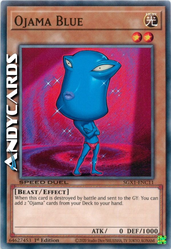 Quando questa carta viene distrutta in battaglia e mandata al Cimitero, puoi aggiungere 2 carte "Ojama" dal tuo Deck alla tua mano (puoi scegliere anche la carta "Ojamuscoli").