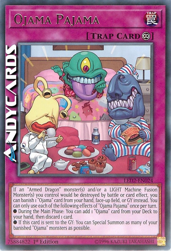 Se uno o più mostri "Drago Armato" e/o Mostri Fusione LUCE Macchina che controlli stanno per essere distrutti in battaglia o dall'effetto di una carta, puoi invece bandire 1 carta "Ojama" dalla tua mano, Terreno scoperto, o Cimitero. Puoi utilizzare ognuno dei seguenti effetti di "Ojama Pigiama" una sola volta per turno.