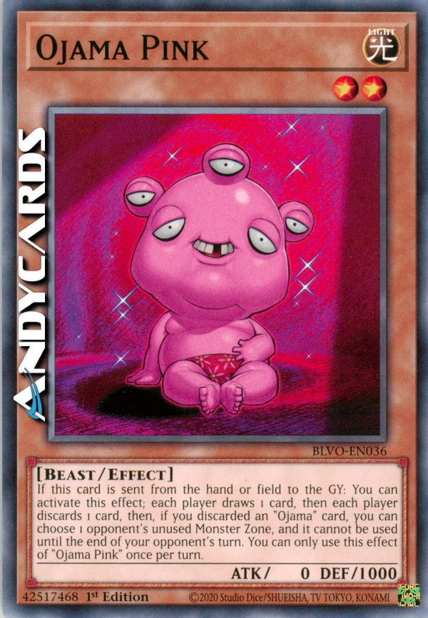 If this card is sent from the hand or field to the GY: You can activate this effect; each player draws 1 card, then each player discards 1 card, then, if you discarded an "Ojama" card, you can choose 1 opponent's unused Monster Zone, and it cannot be used until the end of your opponent's turn. You can only use this effect of "Ojama Pink" once per turn.