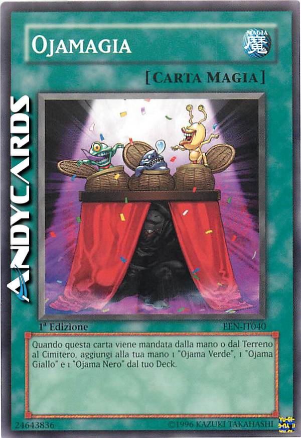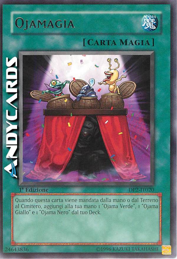 Quando questa carta viene mandata dalla mano o dal terreno al cimitero, aggiungi alla tua mano 1 OJAMA VERDE, 1 OJAMA GIALLO E 1 OJAMA NERO dal tuo deck.