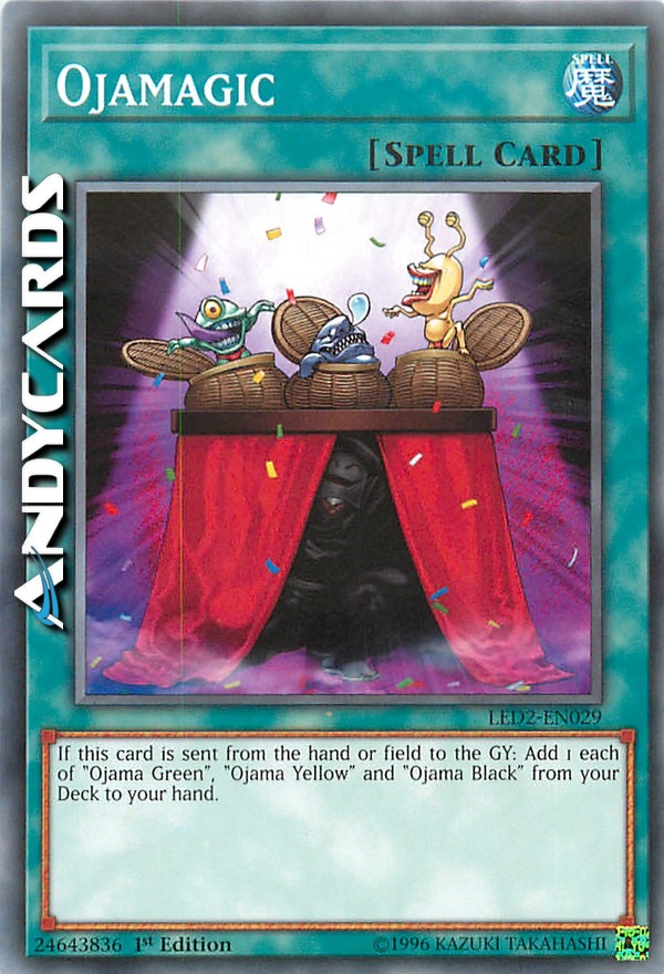 If this card is sent from the hand or field to the GY: Add 1 each of "Ojama Green", "Ojama Yellow" and "Ojama Black" from your Deck to your hand.