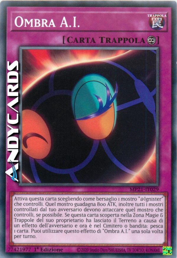 Attiva questa carta scegliendo come bersaglio 1 mostro "@Ignister" che controlli. Quel mostro guadagna 800 ATK, inoltre tutti i mostri controllati dal tuo avversario devono attaccare quel mostro che controlli, se possibile. Se questa carta scoperta nella Zona Magie & Trappole del suo proprietario ha lasciato il Terreno a causa di un effetto dell'avversario e ora è nel Cimitero o bandita: pesca 1 carta. Puoi utilizzare questo effetto di "Ombra A.I." una sola volta per turno.