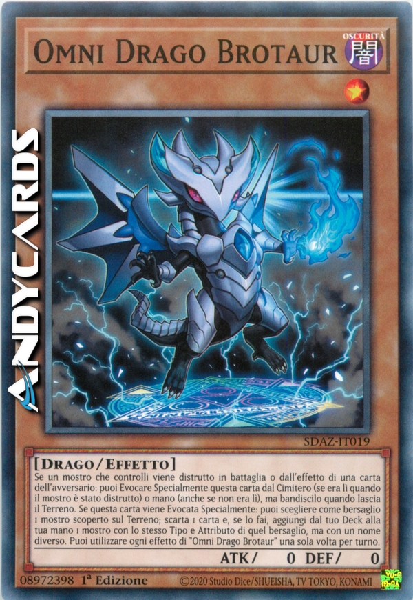 If a monster you control is destroyed by battle or an opponent's card effect: You can Special Summon this card from the GY (if it was there when the monster was destroyed) or hand (even if not), but banish it when it leaves the field. If this card is Special Summoned: You can target 1 face-up monster on the field; discard 1 card, and if you do, add 1 monster from your Deck to your hand, with the same Type and Attribute as that target, but a different name. You can only use each effect of "Omni Dragon Brotaur" once per turn.