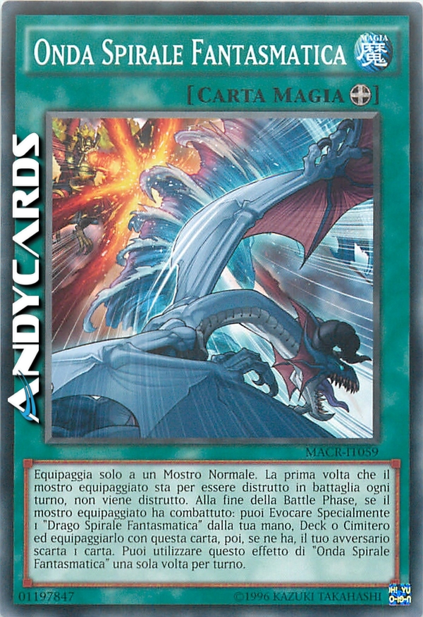 Equipaggia solo a un Mostro Normale. La prima volta che il mostro equipaggiato sta per essere distrutto in battaglia ogni turno, non viene distrutto. Alla fine della Battle Phase, se il mostro equipaggiato ha combattuto: puoi Evocare Specialmente 1 "Drago Spirale Fantasmatica" dalla tua mano, Deck o Cimitero ed equipaggiarlo con questa carta, poi, se ne ha, il tuo avversario scarta 1 carta. Puoi utilizzare questo effetto di "Onda Spirale Fantasmatica" una sola volta per turno.
