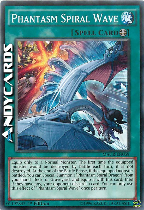 Equip only to a Normal Monster. The first time the equipped monster would be destroyed by battle each turn, it is not destroyed. At the end of the Battle Phase, if the equipped monster battled: You can Special Summon 1 "Phantasm Spiral Dragon" from your hand, Deck, or Graveyard, and equip it with this card, then if they have any, your opponent discards 1 card. You can only use this effect of "Phantasm Spiral Wave" once per turn.
