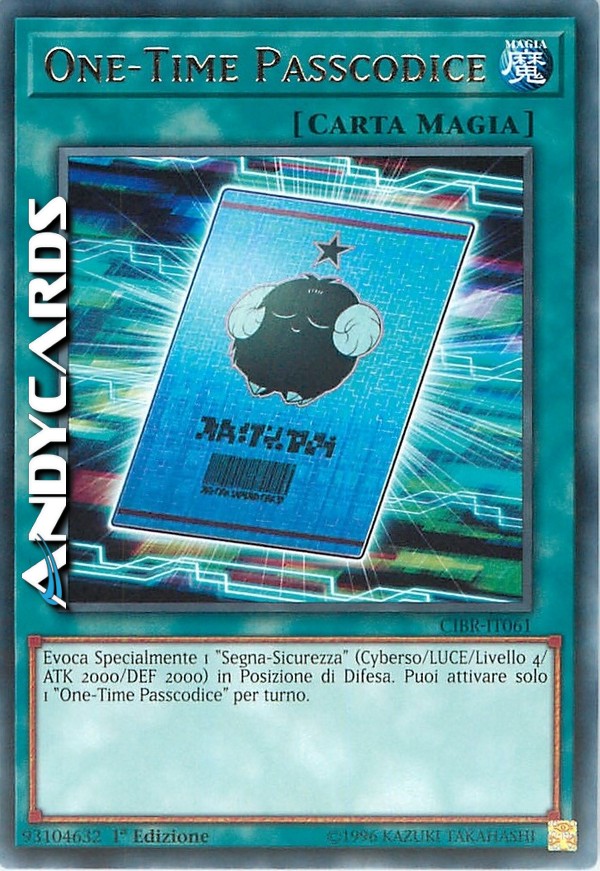 Evoca Specialmente 1 "Segna-Sicurezza" (Cyberso/LUCE/Livello 4/ATK 2000/DEF 2000) in Posizione di Difesa. Puoi attivare solo 1 "One-Time Passcodice" per turno.