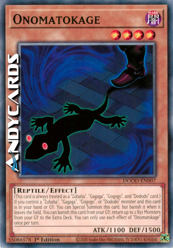 Se controlli un mostro "Zubaba", "Gagaga", "Gogogo" o "Dododo" e questa carta è nella tua mano o Cimitero: puoi Evocare Specialmente questa carta, ma bandiscila quando lascia il Terreno. Puoi bandire questa carta dal tuo Cimitero; fai ritornare fino a 2 Mostri Xyz dal tuo Cimitero nell'Extra Deck. Puoi utilizzare ogni effetto di "Onomatokage" una sola volta per turno.