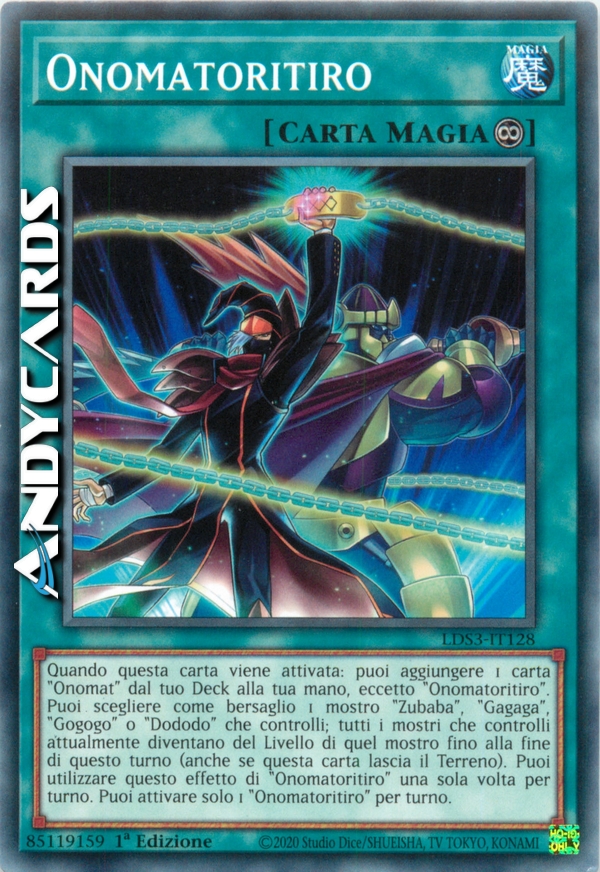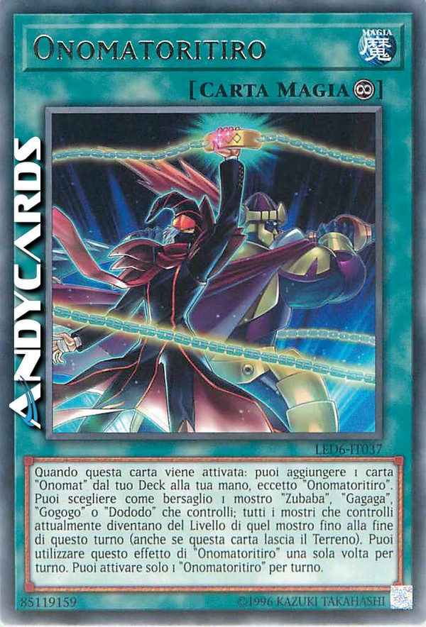 Quando questa carta viene attivata: puoi aggiungere 1 carta "Onomat" dal tuo Deck alla tua mano, eccetto "Onomatoritiro". Puoi scegliere come bersaglio 1 mostro "Zubaba", "Gagaga", "Gogogo" o "Dododo" che controlli; tutti i mostri che controlli attualmente diventano del Livello di quel mostro fino alla fine di questo turno (anche se questa carta lascia il Terreno). Puoi utilizzare questo effetto di "Onomatoritiro" una sola volta per turno. Puoi attivare solo 1 "Onomatoritiro" per turno.