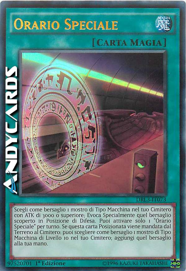 Scegli come bersaglio 1 mostro Macchina nel tuo Cimitero con ATK di 3000 o superiore; Evoca Specialmente quel bersaglio in Posizione di Difesa. Se questa carta Posizionata viene mandata dal Terreno al Cimitero: puoi scegliere come bersaglio 1 mostro Macchina di Livello 10 nel tuo Cimitero; aggiungi quel bersaglio alla tua mano. Puoi attivare solo 1 "Orario Speciale" per turno.