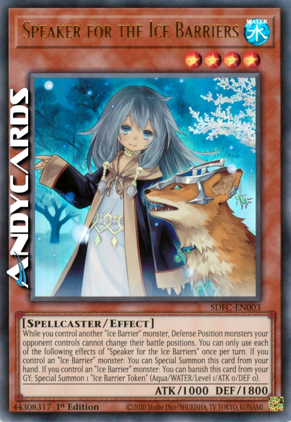 While you control another "Ice Barrier" monster, Defense Position monsters your opponent controls cannot change their battle positions. You can only use each of the following effects of "Speaker for the Ice Barriers" once per turn. If you control an "Ice Barrier" monster: You can Special Summon this card from your hand. If you control an "Ice Barrier" monster: You can banish this card from your GY; Special Summon 1 "Ice Barrier Token" (Aqua/WATER/Level 1/ATK 0/DEF 0).