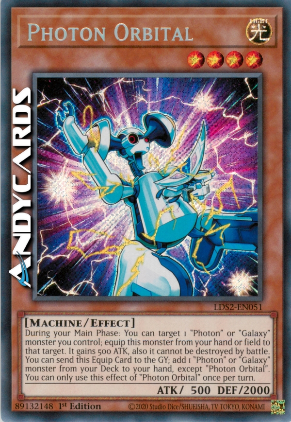 Durante la tua Main Phase: puoi scegliere come bersaglio 1 mostro "Fotonico" o "Galattico" che controlli; equipaggia questo mostro dalla tua mano o Terreno a quel bersaglio. Esso guadagna 500 ATK, inoltre non può essere distrutto in battaglia. Puoi mandare questa Carta Equipaggiamento al Cimitero; aggiungi 1 mostro "Fotonico" o "Galattico" dal tuo Deck alla tua mano, eccetto "Orbitale Fotonico". Puoi utilizzare questo effetto di "Orbitale Fotonico" una sola volta per turno.