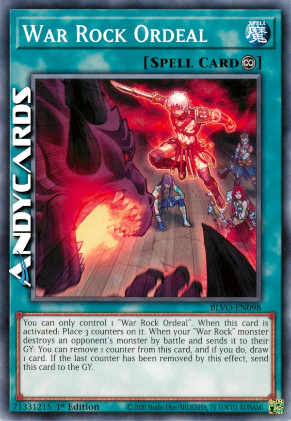 Puoi controllare solo 1 "Ordalia Roccia di Guerra". Quando questa carta viene attivata: metti 3 segnalini su di essa. Quando un tuo mostro "Roccia di Guerra" distrugge un mostro dell'avversario in battaglia e lo manda al suo Cimitero: puoi rimuovere 1 segnalino da questa carta e, se lo fai, pesca 1 carta. Se l'ultimo segnalino è stato rimosso da questo effetto, manda questa carta al Cimitero.