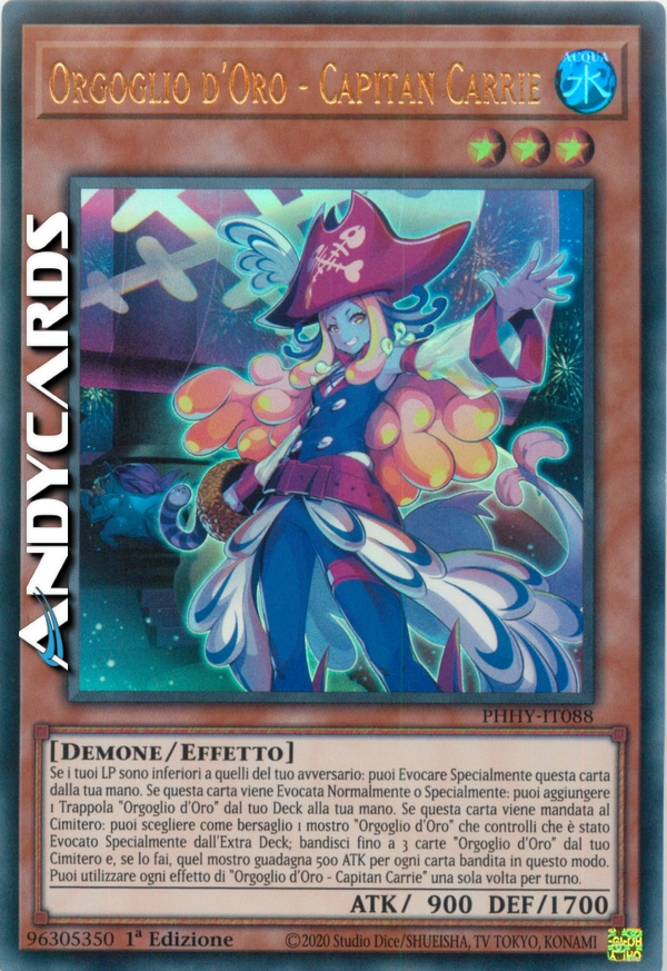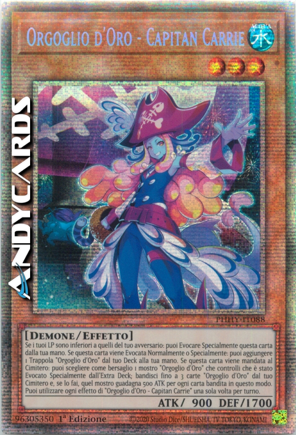 Se i tuoi LP sono inferiori a quelli del tuo avversario: puoi Evocare Specialmente questa carta dalla tua mano. Se questa carta viene Evocata Normalmente o Specialmente: puoi aggiungere 1 Trappola "Orgoglio d'Oro" dal tuo Deck alla tua mano. Se questa carta viene mandata al Cimitero: puoi scegliere come bersaglio 1 mostro "Orgoglio d'Oro" che controlli che è stato Evocato Specialmente dall'Extra Deck; bandisci fino a 3 carte "Orgoglio d'Oro" dal tuo Cimitero e, se lo fai, quel mostro guadagna 500 ATK per ogni carta bandita in questo modo. Puoi utilizzare ogni effetto di "Orgoglio d'Oro - Capitan Carrie" una sola volta per turno.
