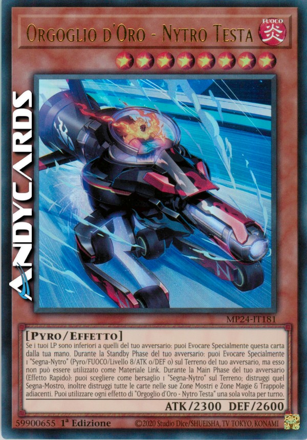 Se i tuoi LP sono inferiori a quelli del tuo avversario: puoi Evocare Specialmente questa carta dalla tua mano. Durante la Standby Phase del tuo avversario: puoi Evocare Specialmente 1 "Segna-Nytro" (Pyro/FUOCO/Livello 8/ATK 0/DEF 0) sul Terreno del tuo avversario, ma esso non può essere utilizzato come Materiale Link. Durante la Main Phase del tuo avversario (Effetto Rapido): puoi scegliere come bersaglio 1 "Segna-Nytro" sul Terreno; distruggi quel Segna-Mostro, inoltre distruggi tutte le carte nelle sue Zone Mostri e Zone Magie & Trappole adiacenti. Puoi utilizzare ogni effetto di "Orgoglio d'Oro - Nytro Testa" una sola volta per turno.