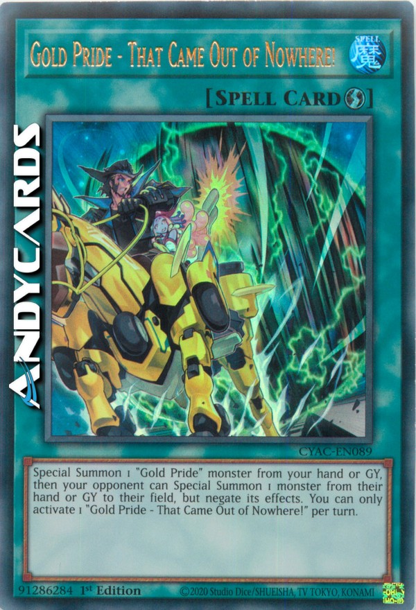 Special Summon 1 "Gold Pride" monster from your hand or GY, then your opponent can Special Summon 1 monster from their hand or GY to their field, but negate its effects. You can only activate 1 "Gold Pride - That Came Out of Nowhere!" per turn.