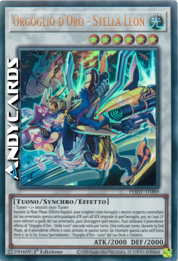 Durante la Main Phase (Effetto Rapido): puoi scegliere come bersaglio 1 mostro scoperto controllato dal tuo avversario; questa carta guadagna ATK pari all'ATK originale di quel bersaglio, poi, se i tuoi LP sono inferiori a quelli del tuo avversario, puoi distruggere quel mostro. Puoi utilizzare il precedente effetto di "Orgoglio d'Oro - Stella Leon" una sola volta per turno. Una volta per turno, durante la End Phase, se il precedente effetto è stato attivato in questo turno: fai ritornare questa carta nell'Extra Deck e, se lo fai, Evoca Specialmente 1 "Orgoglio d'Oro - Leon" dal tuo Deck o Cimitero.