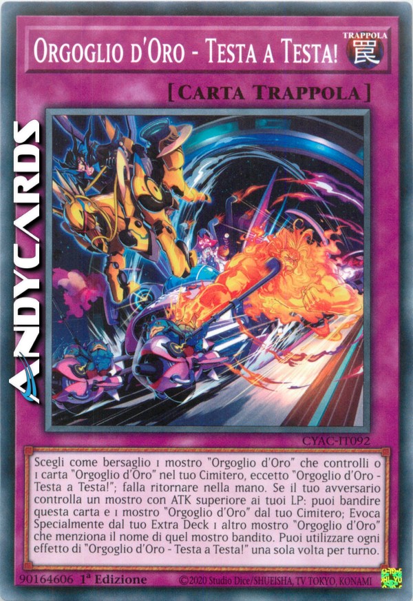 Scegli come bersaglio 1 mostro "Orgoglio d'Oro" che controlli o 1 carta "Orgoglio d'Oro" nel tuo Cimitero, eccetto "Orgoglio d'Oro - Testa a Testa!"; falla ritornare nella mano. Se il tuo avversario controlla un mostro con ATK superiore ai tuoi LP: puoi bandire questa carta e 1 mostro "Orgoglio d'Oro" dal tuo Cimitero; Evoca Specialmente dal tuo Extra Deck 1 altro mostro "Orgoglio d'Oro" che menziona il nome di quel mostro bandito. Puoi utilizzare ogni effetto di "Orgoglio d'Oro - Testa a Testa!" una sola volta per turno.