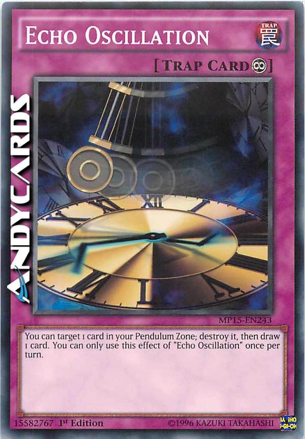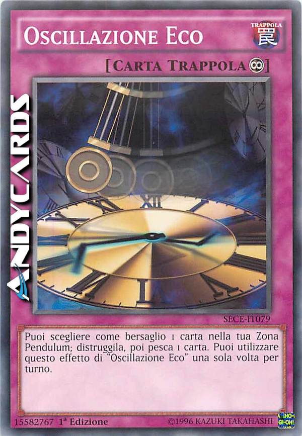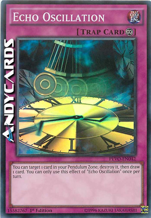 Puoi scegliere come bersaglio 1 carta nella tua Zona Pendulum; distruggila, poi pesca 1 carta. Puoi utilizzare questo effetto di "Oscillazione Eco" una sola volta per turno.