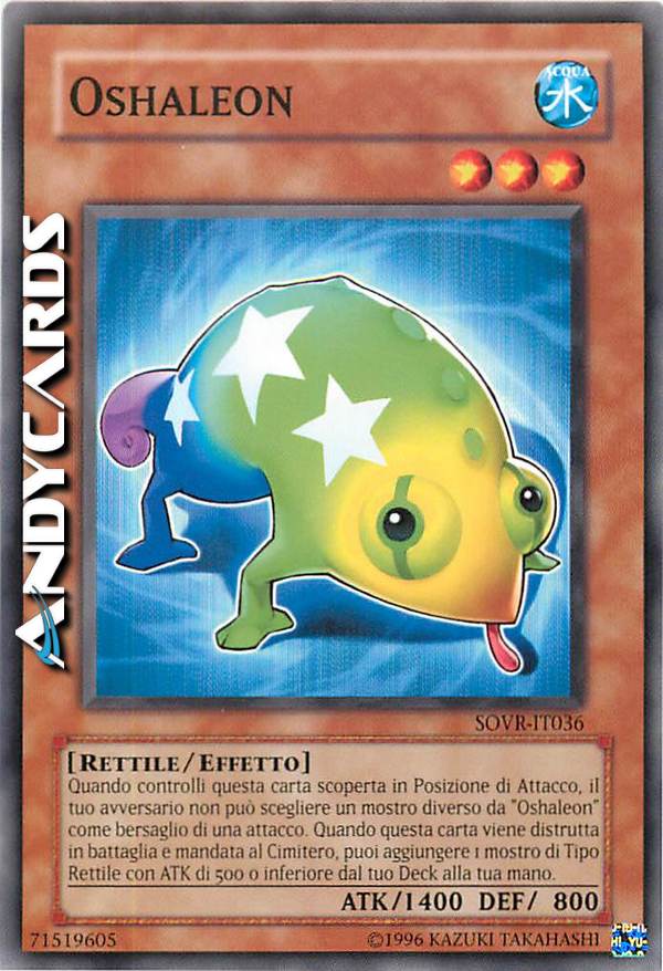 Quando controlli questa carta scoperta in Posizione di Attacco, il tuo avversario non può scegliere un mostro diverso da "Oshaleon" come bersaglio di un attacco. Quando questa carta viene distrutta in battaglia e mandata al Cimitero, puoi aggiungere 1 mostro di Tipo Rettile con ATK di 500 o inferiore dal tuo Deck alla tua mano.