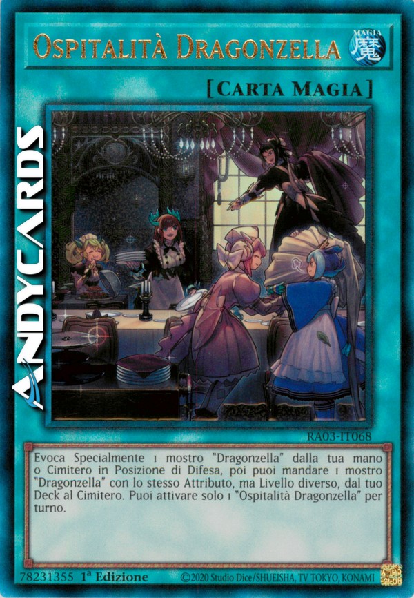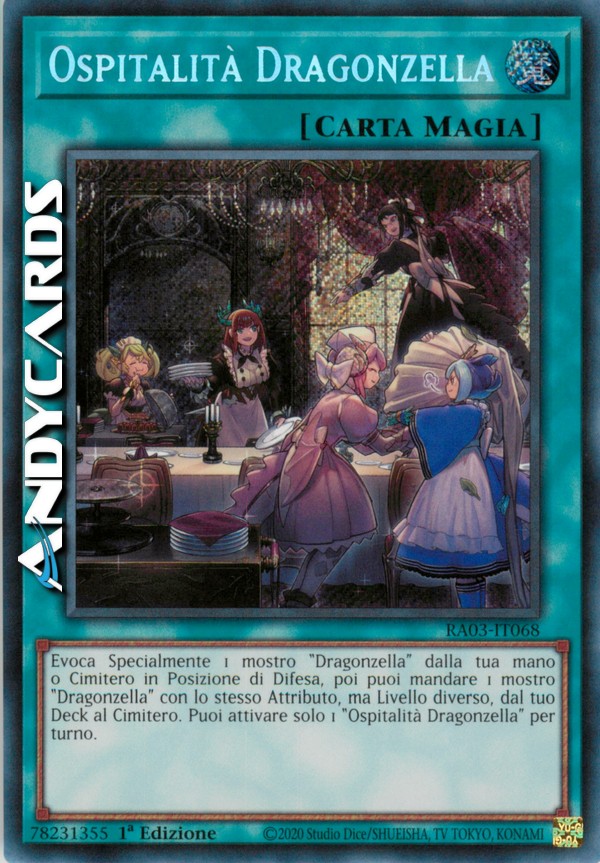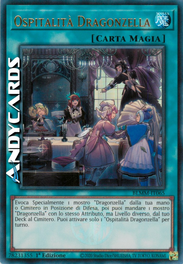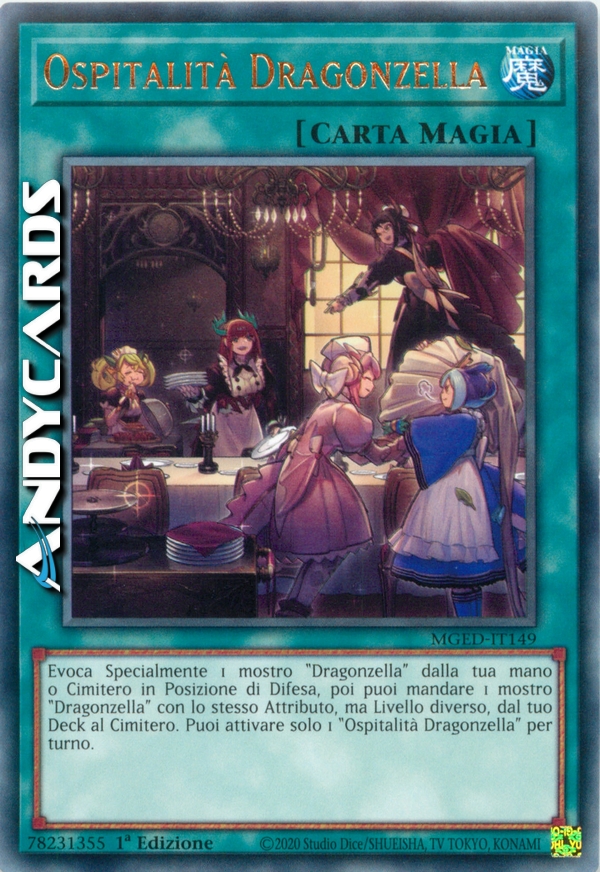 Evoca Specialmente 1 mostro "Dragonzella" dalla tua mano o Cimitero in Posizione di Difesa, poi puoi mandare 1 mostro "Dragonzella" con lo stesso Attributo, ma Livello diverso, dal tuo Deck al Cimitero. Puoi attivare solo 1 "Ospitalità Dragonzella" per turno.