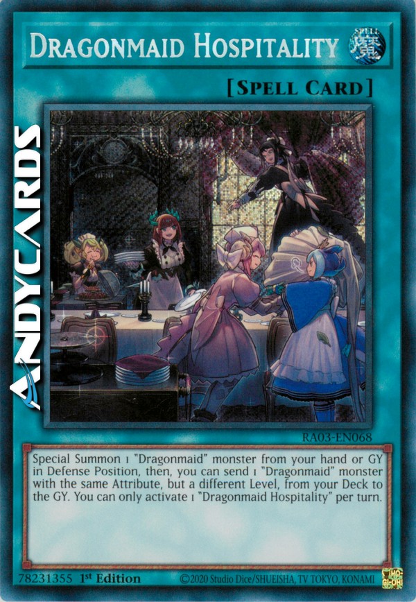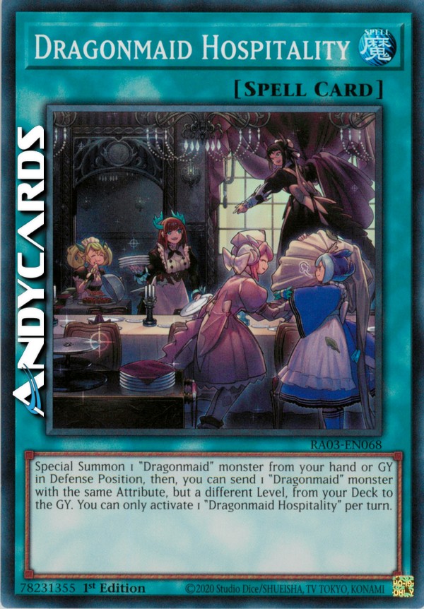 Special Summon 1 "Dragonmaid" monster from your hand or GY in Defense Position, then, you can send 1 "Dragonmaid" monster with the same Attribute, but a different Level, from your Deck to the GY. You can only activate 1 "Dragonmaid Hospitality" per turn.