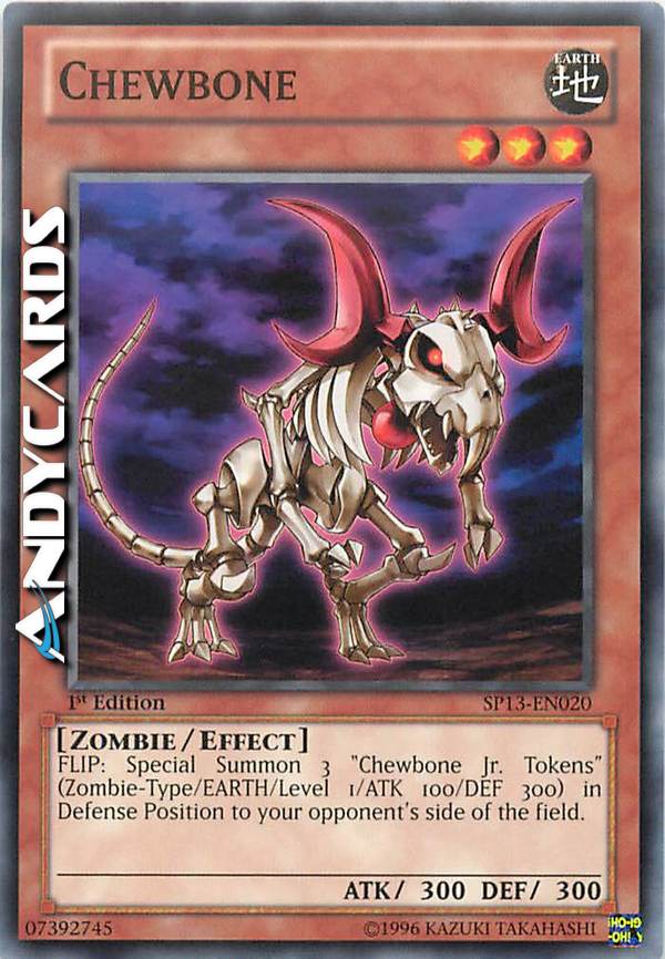 FLIP: Special Summon 3 "Chewbone Jr. Tokens" (Zombie-Type/EARTH/Level 1/ATK 100 / DEF 300) in Defense Position to your opponent's side of the field.
