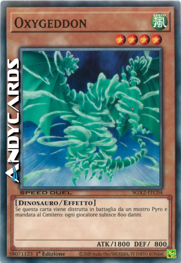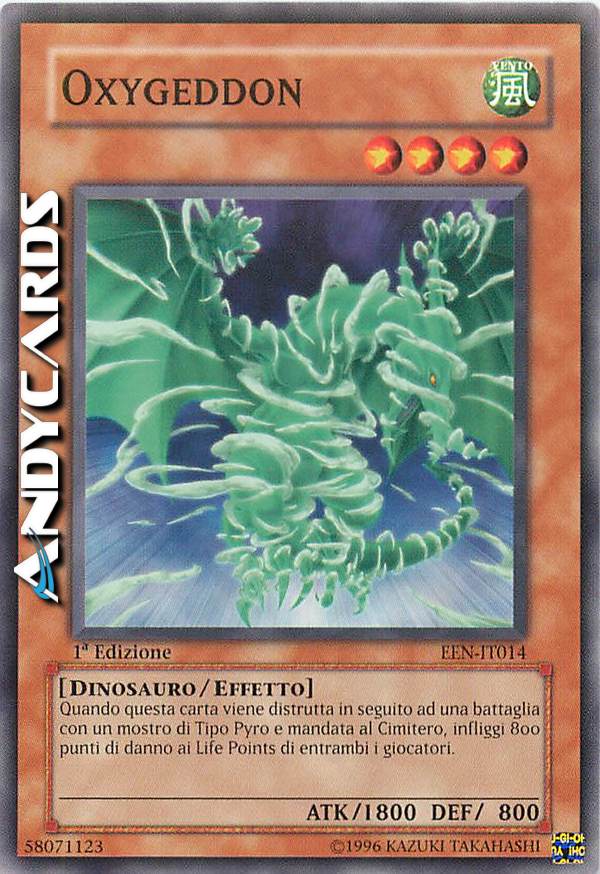 Quando questa carta viene distrutta in battaglia da un mostro di tipo Pyro e mandata al Cimitero, infliggi 800 danni ad entrambi i giocatori.