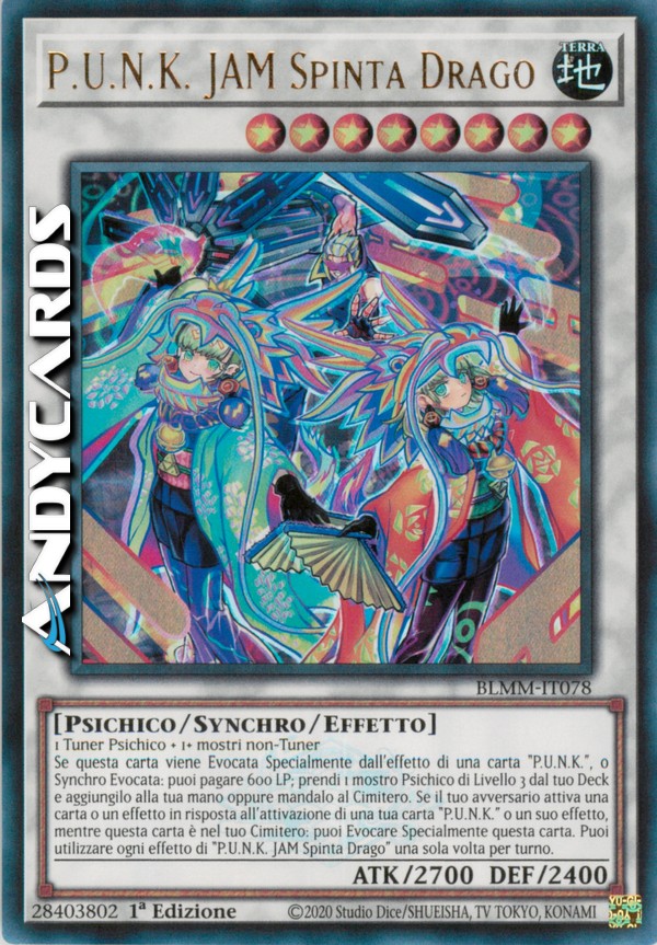 1 Tuner Psichico + 1+ mostri non-Tuner Se questa carta viene Evocata Specialmente dall'effetto di una carta "P.U.N.K." card, o Synchro Evocata: puoi pagare 600 LP; prendi 1 mostro Psichico di Livello 3 dal tuo Deck e aggiungilo alla tua mano oppure mandalo al Cimitero. Se il tuo avversario attiva una carta o un effetto in risposta all'attivazione di una tua carta "P.U.N.K." o un suo effetto, mentre questa carta è nel tuo Cimitero: puoi Evocare Specialmente questa carta. Puoi utilizzare ogni effetto di "P.U.N.K. JAM Spinta Drago" una sola volta per turno.