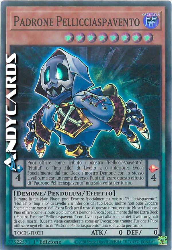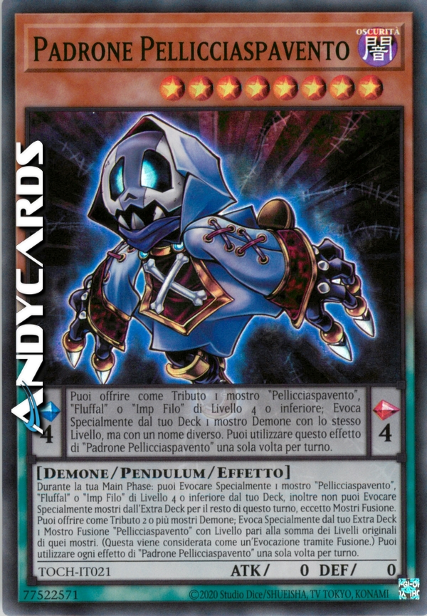 Effetto Pendulum: Puoi offrire come Tributo 1 mostro "Pellicciaspavento", "Fluffal" o "Imp Filo" di Livello 4 o inferiore; Evoca Specialmente dal tuo Deck 1 mostro Demone con lo stesso Livello, ma con un nome diverso. Puoi utilizzare questo effetto di "Padrone Pellicciaspavento" una sola volta per turno.