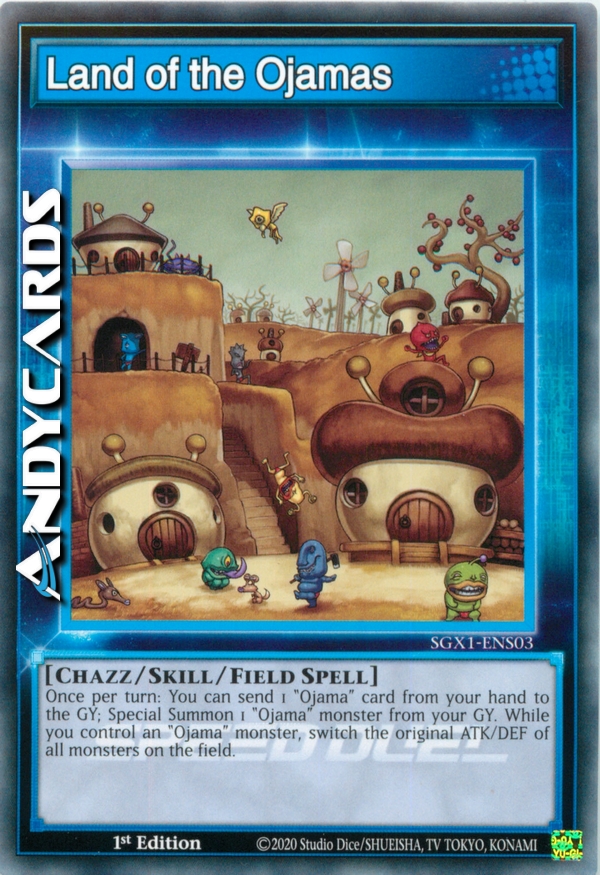 Una volta per turno: puoi mandare 1 carta "Ojama" dalla tua mano al Cimitero; Evoca Specialmente 1 mostro "Ojama" dal tuo Cimitero. Mentre controlli un mostro "Ojama", scambia gli ATK/DEF originali di tutti i mostri sul Terreno.