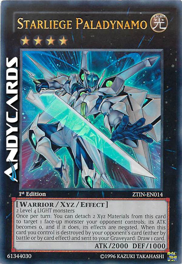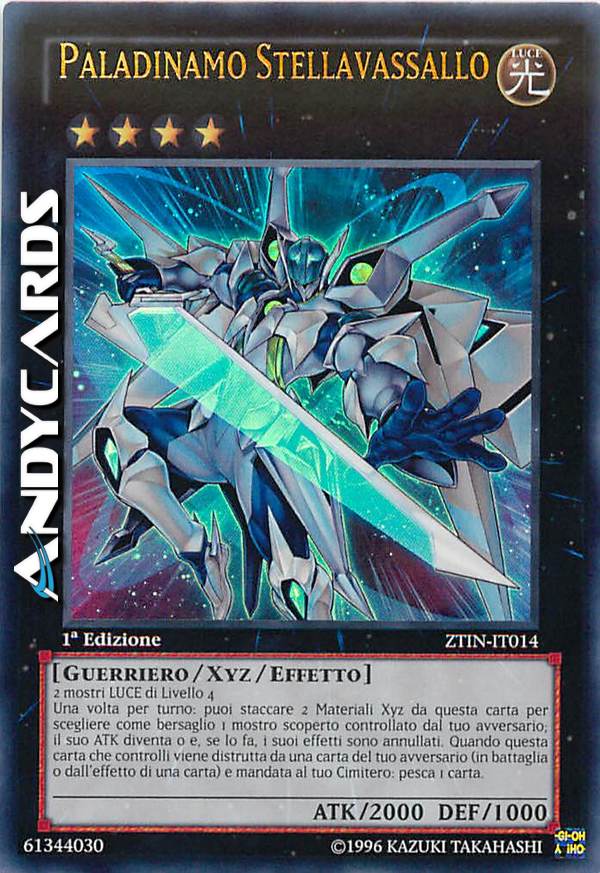 2 mostri LUCE di Livello 4 - Una volta per turno: puoi staccare 2 Materiali Xyz da questa carta, poi scegliere come bersaglio 1 mostro scoperto controllato dal tuo avversario; cambia il suo ATK a 0 e, se lo fai, i suoi effetti si annullano. Se questa carta che controlli viene distrutta da una carta dell'avversario (in battaglia o dall'effetto di una carta) e mandata al tuo Cimitero: pesca 1 carta.
