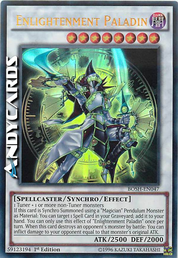 If this card is Synchro Summoned using a "Magician" Pendulum Monster as material: You can target 1 Spell in your GY; add it to your hand. You can only use this effect of "Enlightenment Paladin" once per turn. When this card destroys an opponent's monster by battle: You can inflict damage to your opponent equal to that monster's original ATK.