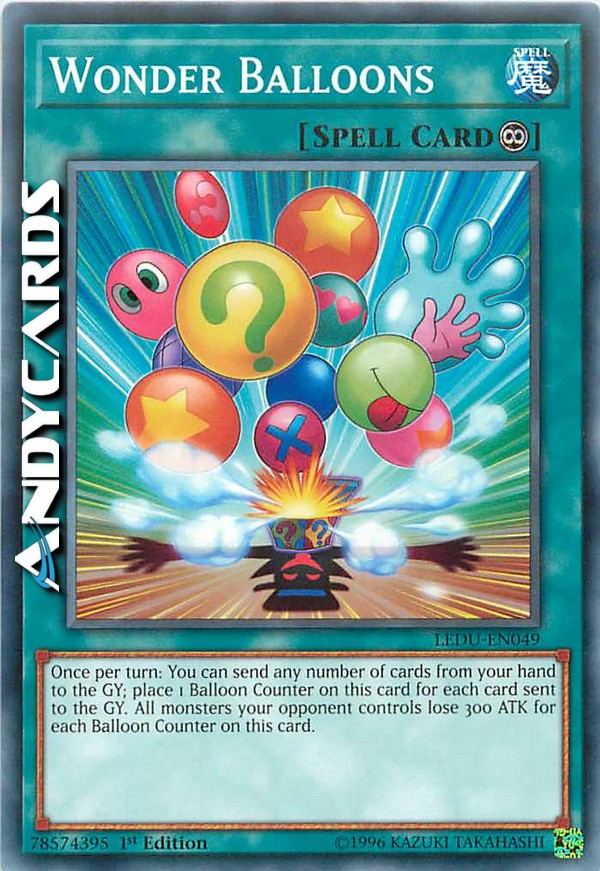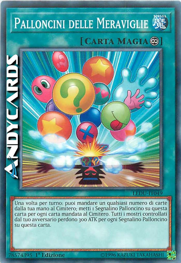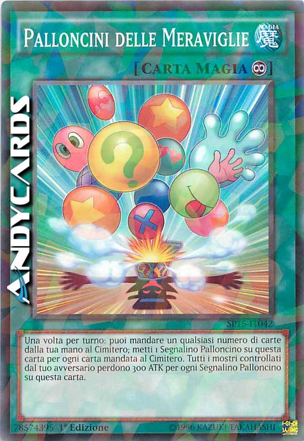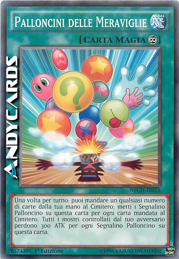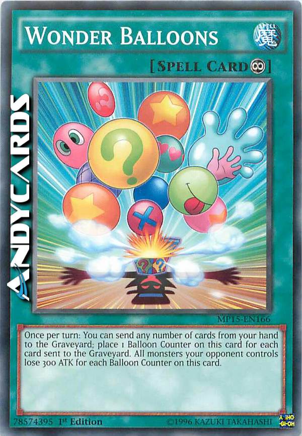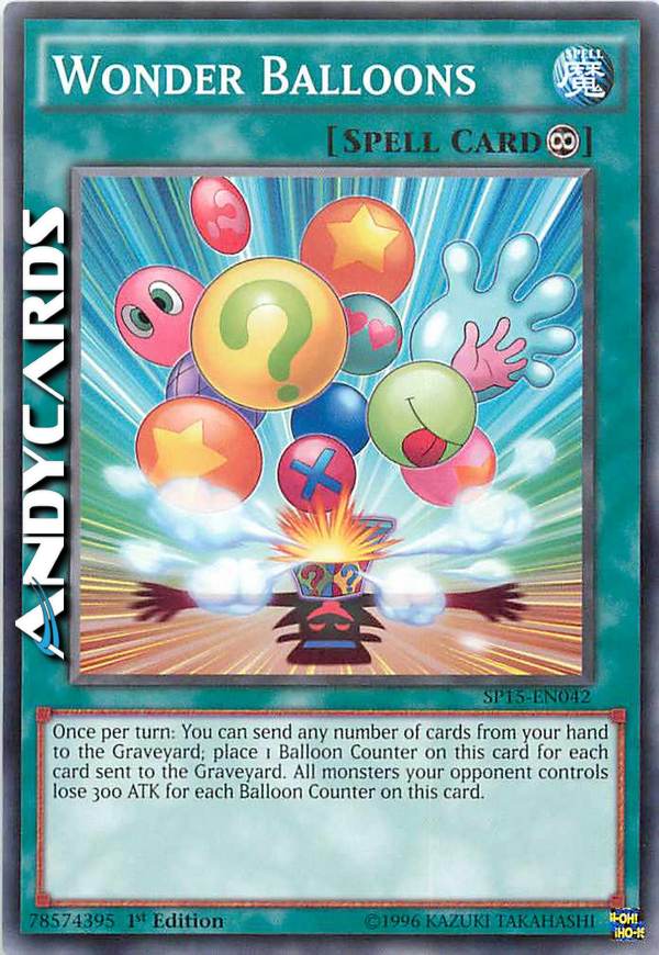 Una volta per turno: puoi mandare un qualsiasi numero di carte dalla tua mano al Cimitero; metti 1 Segnalino Palloncino su questa carta per ogni carta mandata al Cimitero. Tutti i mostri controllati dal tuo avversario perdono 300 ATK per ogni Segnalino Palloncino su questa carta.