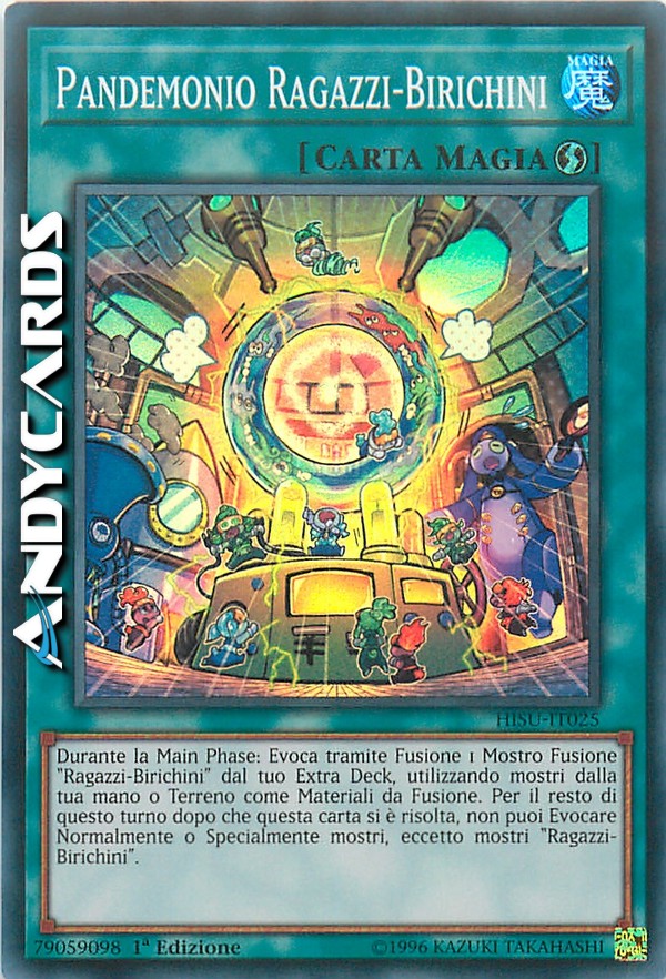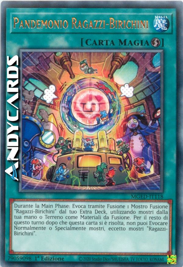Durante la Main Phase: Evoca tramite Fusione 1 Mostro Fusione "Ragazzi-Birichini" dal tuo Extra Deck, utilizzando mostri dalla tua mano o Terreno come Materiali da Fusione. Per il resto di questo turno dopo che questa carta si è risolta, non puoi Evocare Normalmente o Specialmente mostri, eccetto mostri "Ragazzi-Birichini".