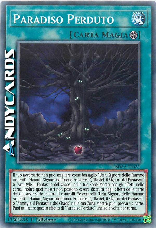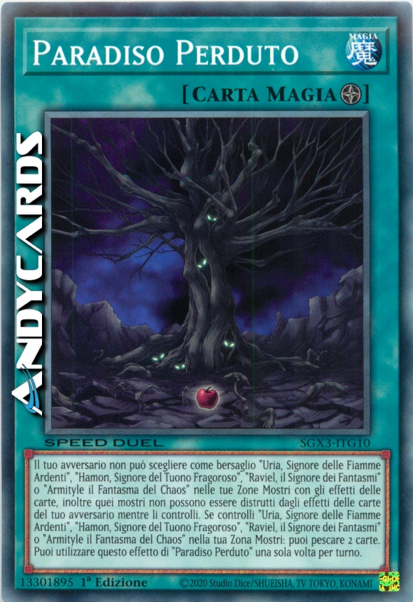 Il tuo avversario non può scegliere come bersaglio "Uria, Signore delle Fiamme Ardenti", "Hamon, Signore del Tuono Fragoroso", "Raviel, il Signore dei Fantasmi" o "Armityle il Fantasma del Chaos" nelle tue Zone Mostri con gli effetti delle carte, inoltre quei mostri non possono essere distrutti dagli effetti delle carte del tuo avversario mentre li controlli. Se controlli "Uria, Signore delle Fiamme Ardenti", "Hamon, Signore del Tuono Fragoroso", "Raviel, il Signore dei Fantasmi" o "Armityle il Fantasma del Chaos" in una tua Zona Mostri: puoi pescare 2 carte. Puoi utilizzare questo effetto di "Paradiso Perduto" una sola volta per turno.