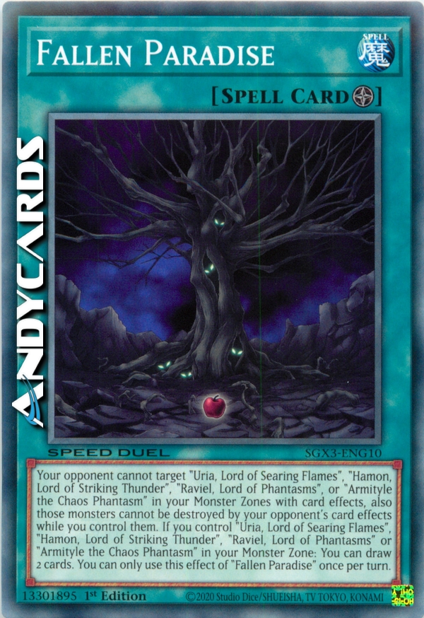 Your opponent cannot target "Uria, Lord of Searing Flames", "Hamon, Lord of Striking Thunder", "Raviel, Lord of Phantasms", or "Armityle the Chaos Phantasm" in your Monster Zones with card effects, also those monsters cannot be destroyed by your opponent's card effects while you control them. If you control "Uria, Lord of Searing Flames", "Hamon, Lord of Striking Thunder", "Raviel, Lord of Phantasms" or "Armityle the Chaos Phantasm" in your Monster Zone: You can draw 2 cards. You can only use this effect of "Fallen Paradise" once per turn.