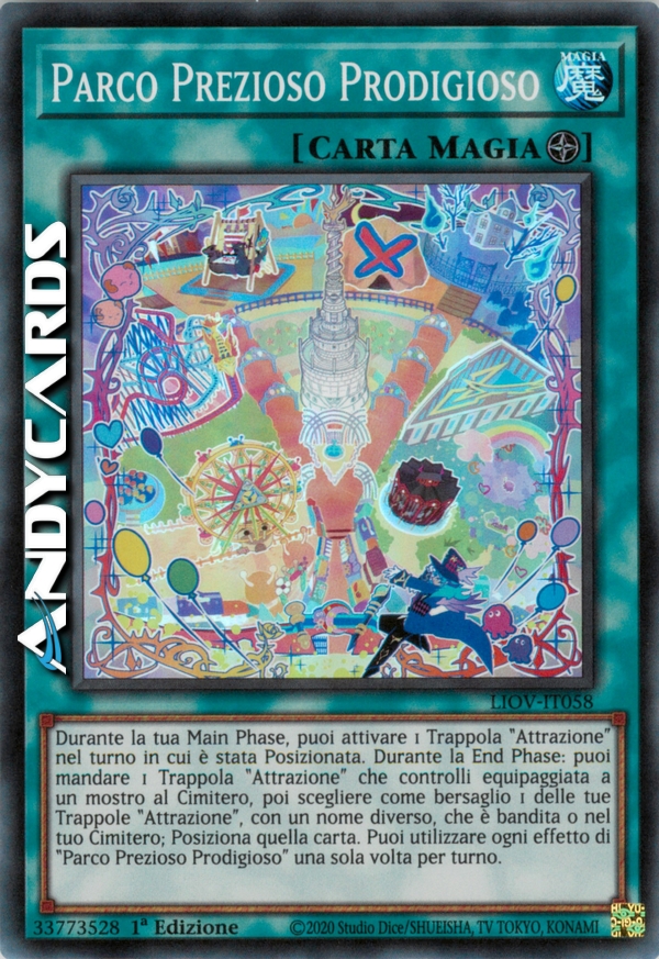During your Main Phase, you can activate 1 "Attraction" Trap the turn it was Set. During the End Phase: You can send 1 "Attraction" Trap you control equipped to a monster to the GY, then target 1 of your "Attraction" Traps, with a different name, that is banished or in your GY; Set that card. You can only use each effect of "Amazement Precious Park" once per turn.