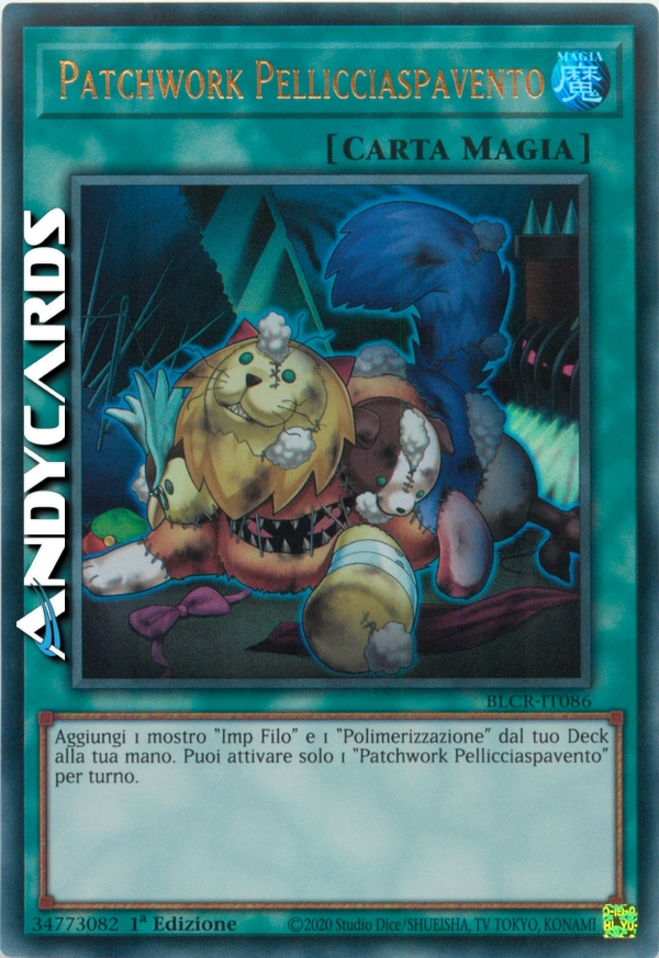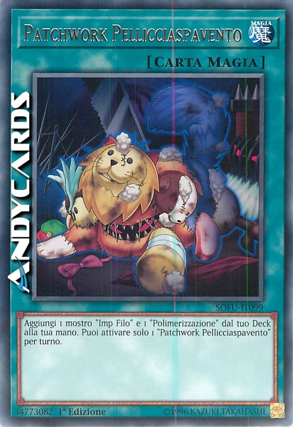 Aggiungi 1 mostro "Imp Filo" e 1 "Polimerizzazione" dal tuo Deck alla tua mano. Puoi attivare solo 1 "Patchwork Pellicciaspavento" per turno.