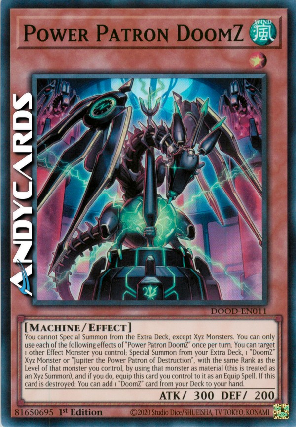 Non puoi Evocare Specialmente dall'Extra Deck, eccetto Mostri Xyz. Puoi utilizzare ognuno dei seguenti effetti di "Patrono Potente DoomZ" una sola volta per turno. Puoi scegliere come bersaglio 1 altro Mostro con Effetto che controlli; Evoca Specialmente dal tuo Extra Deck 1 Mostro Xyz "DoomZ" o "Jupiter il Patrono Potente della Distruzione", con lo stesso Rango del Livello di quel mostro che controlli, utilizzando quel mostro come materiale (questa viene considerata come un'Evocazione Xyz) e, se lo fai, equipaggia questa carta che controlli a esso come una Magia Equipaggiamento. Se questa carta viene distrutta: puoi aggiungere 1 carta "DoomZ" dal tuo Deck alla tua mano.