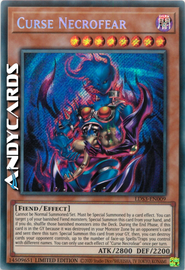 Cannot be Normal Summoned/Set. Must be Special Summoned by a card effect. You can target 3 of your banished Fiend monsters; Special Summon this card from your hand, and if you do, shuffle those banished monsters into the Deck. During the End Phase, if this card is in the GY because it was destroyed in your Monster Zone by an opponent's card and sent there this turn: Special Summon this card from your GY, then, you can destroy cards your opponent controls, up to the number of face-up Spells/Traps you control with different names. You can only use each effect of "Curse Necrofear" once per turn.