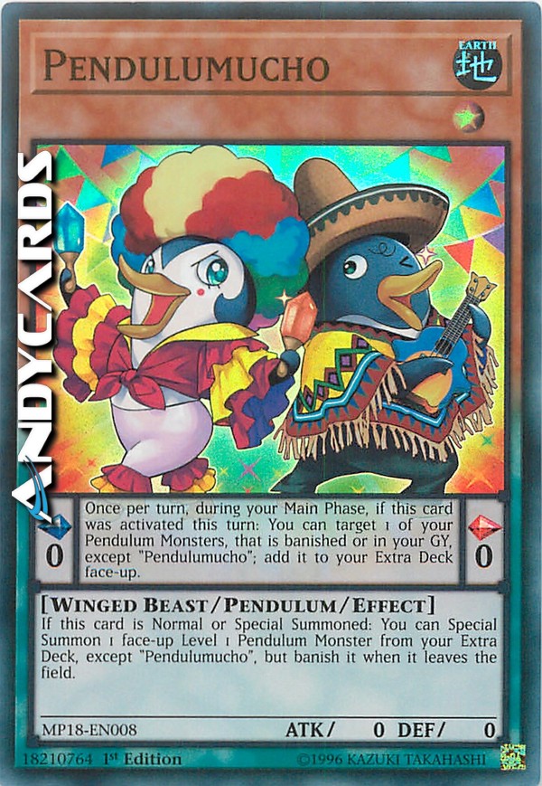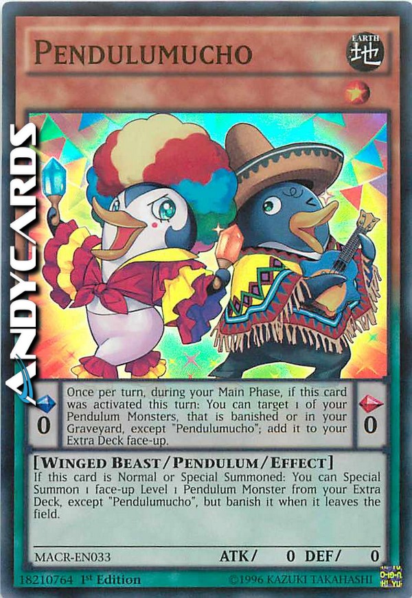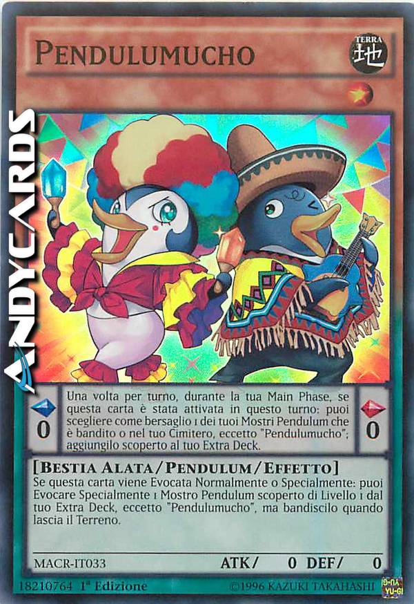 Se questa carta viene Evocata Normalmente o Specialmente: puoi Evocare Specialmente 1 Mostro Pendulum scoperto di Livello 1 dal tuo Extra Deck, eccetto "Pendulumucho", ma bandiscilo quando lascia il Terreno. - Effetto Pendulum: Una volta per turno, durante la tua Main Phase, se questa carta è stata attivata in questo turno: puoi scegliere come bersaglio 1 dei tuoi Mostri Pendulum che è bandito o nel tuo Cimitero, eccetto "Pendulumucho"; aggiungilo scoperto al tuo Extra Deck.