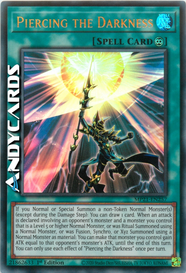 If you Normal or Special Summon a non-Token Normal Monster(s) (except during the Damage Step): You can draw 1 card. When an attack is declared involving an opponent's monster and a monster you control that is a Level 5 or higher Normal Monster, or was Ritual Summoned using a Normal Monster, or was Fusion, Synchro, or Xyz Summoned using a Normal Monster as material: You can make that monster you control gain ATK equal to that opponent's monster's ATK, until the end of this turn. You can only use each effect of "Piercing the Darkness" once per turn.