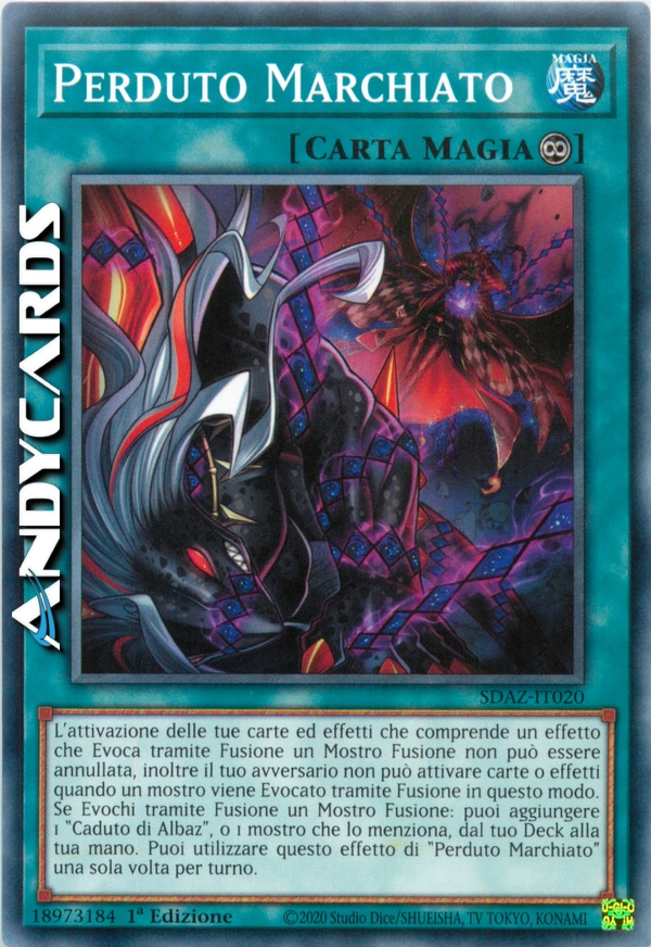 L'attivazione delle tue carte ed effetti che comprende un effetto che Evoca tramite Fusione un Mostro Fusione non può essere annullata, inoltre il tuo avversario non può attivare carte o effetti quando un mostro viene Evocato tramite Fusione in questo modo. Se Evochi tramite Fusione un Mostro Fusione: puoi aggiungere 1 "Caduto di Albaz", o 1 mostro che lo menziona, dal tuo Deck alla tua mano. Puoi utilizzare questo effetto di "Perduto Marchiato" una sola volta per turno.