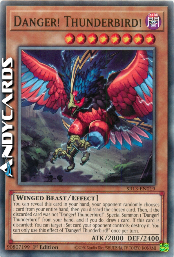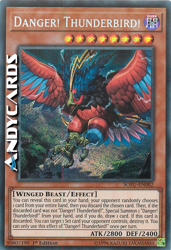 You can reveal this card in your hand; your opponent randomly chooses 1 card from your entire hand, then you discard the chosen card. Then, if the discarded card was not "Danger! Thunderbird!", Special Summon 1 "Danger! Thunderbird!" from your hand, and if you do, draw 1 card. If this card is discarded: You can target 1 Set card your opponent controls; destroy it. You can only use this effect of "Danger! Thunderbird!" once per turn.