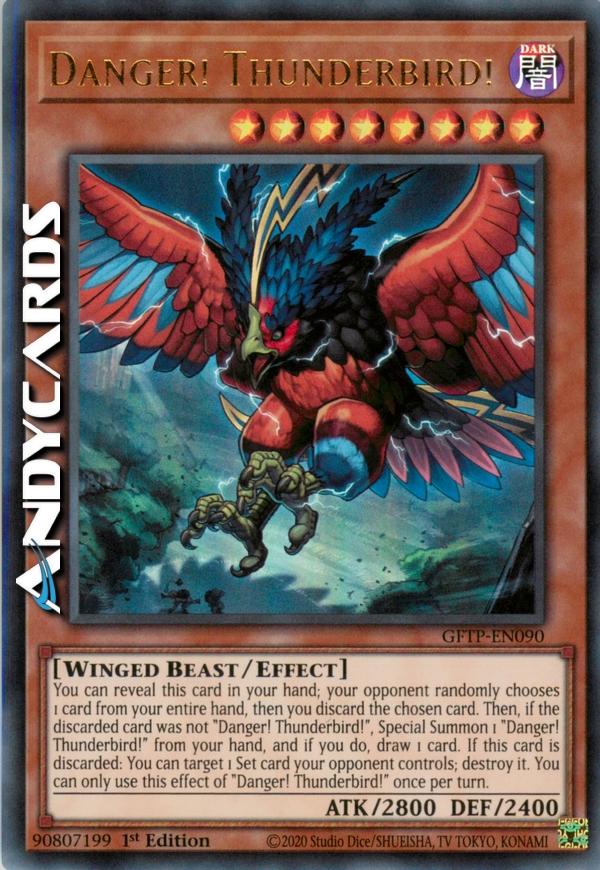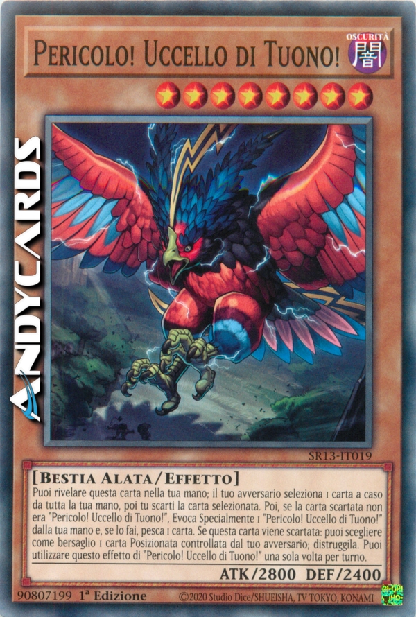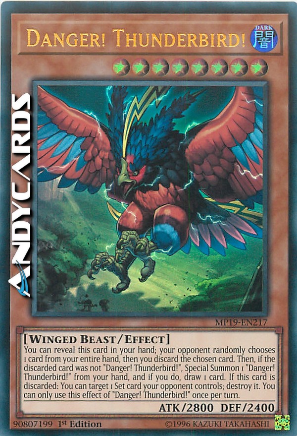 Puoi rivelare questa carta nella tua mano; il tuo avversario seleziona 1 carta a caso dalla tua intera mano, poi tu scarti la carta selezionata. Poi, se la carta scartata non era "Pericolo! Uccello di Tuono!", Evoca Specialmente 1 "Pericolo! Uccello di Tuono!" dalla tua mano e, se lo fai, pesca 1 carta. Se questa carta viene scartata: puoi scegliere come bersaglio 1 carta Posizionata controllata dal tuo avversario; distruggila. Puoi utilizzare questo effetto di "Pericolo! Uccello di Tuono!" una sola volta per turno.
