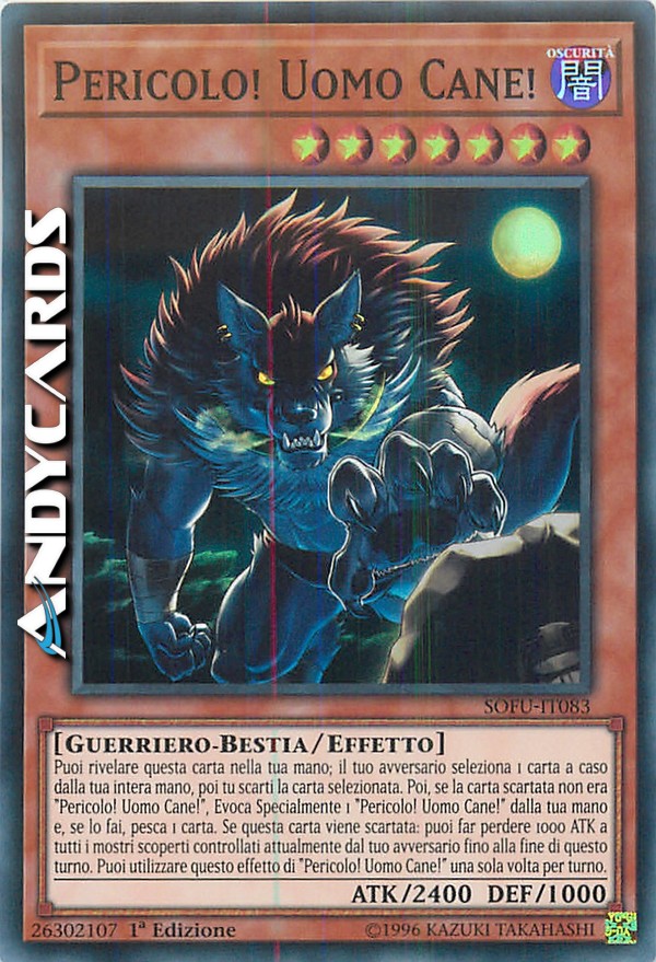 Puoi rivelare questa carta nella tua mano; il tuo avversario seleziona 1 carta a caso dalla tua intera mano, poi tu scarti la carta selezionata. Poi, se la carta scartata non era "Pericolo! Uomo Cane!", Evoca Specialmente 1 "Pericolo! Uomo Cane!" dalla tua mano e, se lo fai, pesca 1 carta. Se questa carta viene scartata: puoi far perdere 1000 ATK a tutti i mostri scoperti controllati attualmente dal tuo avversario fino alla fine di questo turno. Puoi utilizzare questo effetto di "Pericolo! Uomo Cane!" una sola volta per turno.