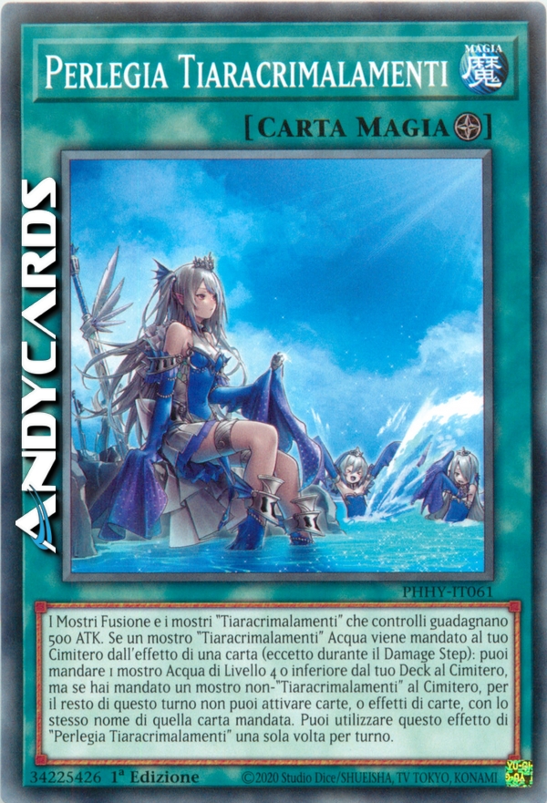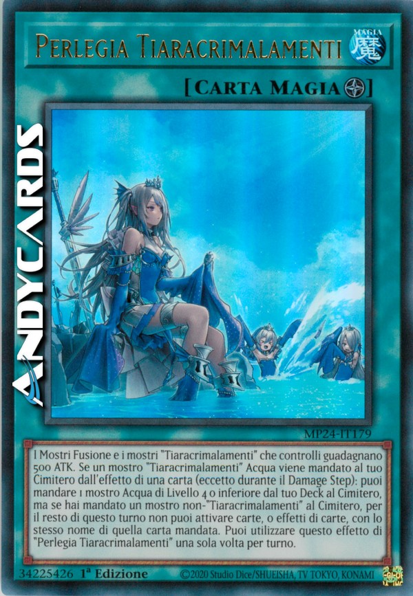 I Mostri Fusione e i mostri "Tiaracrimalamenti" che controlli guadagnano 500 ATK. Se un mostro "Tiaracrimalamenti" Acqua viene mandato al tuo Cimitero dall'effetto di una carta (eccetto durante il Damage Step): puoi mandare 1 mostro Acqua di Livello 4 o inferiore dal tuo Deck al Cimitero, ma se hai mandato un mostro non-"Tiaracrimalamenti" al Cimitero, per il resto di questo turno non puoi attivare carte, o effetti di carte, con lo stesso nome di quella carta mandata. Puoi utilizzare questo effetto di "Perlegia Tiaracrimalamenti" una sola volta per turno.