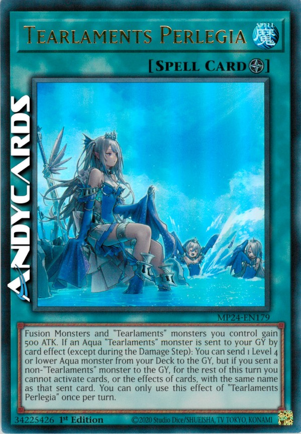 Fusion Monsters and "Tearlaments" monsters you control gain 500 ATK. If an Aqua "Tearlaments" monster is sent to your GY by card effect (except during the Damage Step): You can send 1 Level 4 or lower Aqua monster from your Deck to the GY, but if you sent a non-"Tearlaments" monster to the GY, for the rest of this turn you cannot activate cards, or the effects of cards, with the same name as that sent card. You can only use this effect of "Tearlaments Perlegia" once per turn.