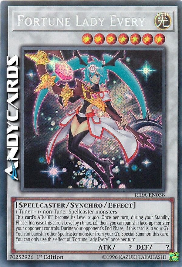 This card's ATK/DEF become its Level x 400. Once per turn, during your Standby Phase: Increase this card's Level by 1 (max. 12), then, you can banish 1 face-up monster your opponent controls. During your opponent's End Phase, if this card is in your GY: You can banish 1 other Spellcaster monster from your GY; Special Summon this card. You can only use this effect of "Fortune Lady Every" once per turn.